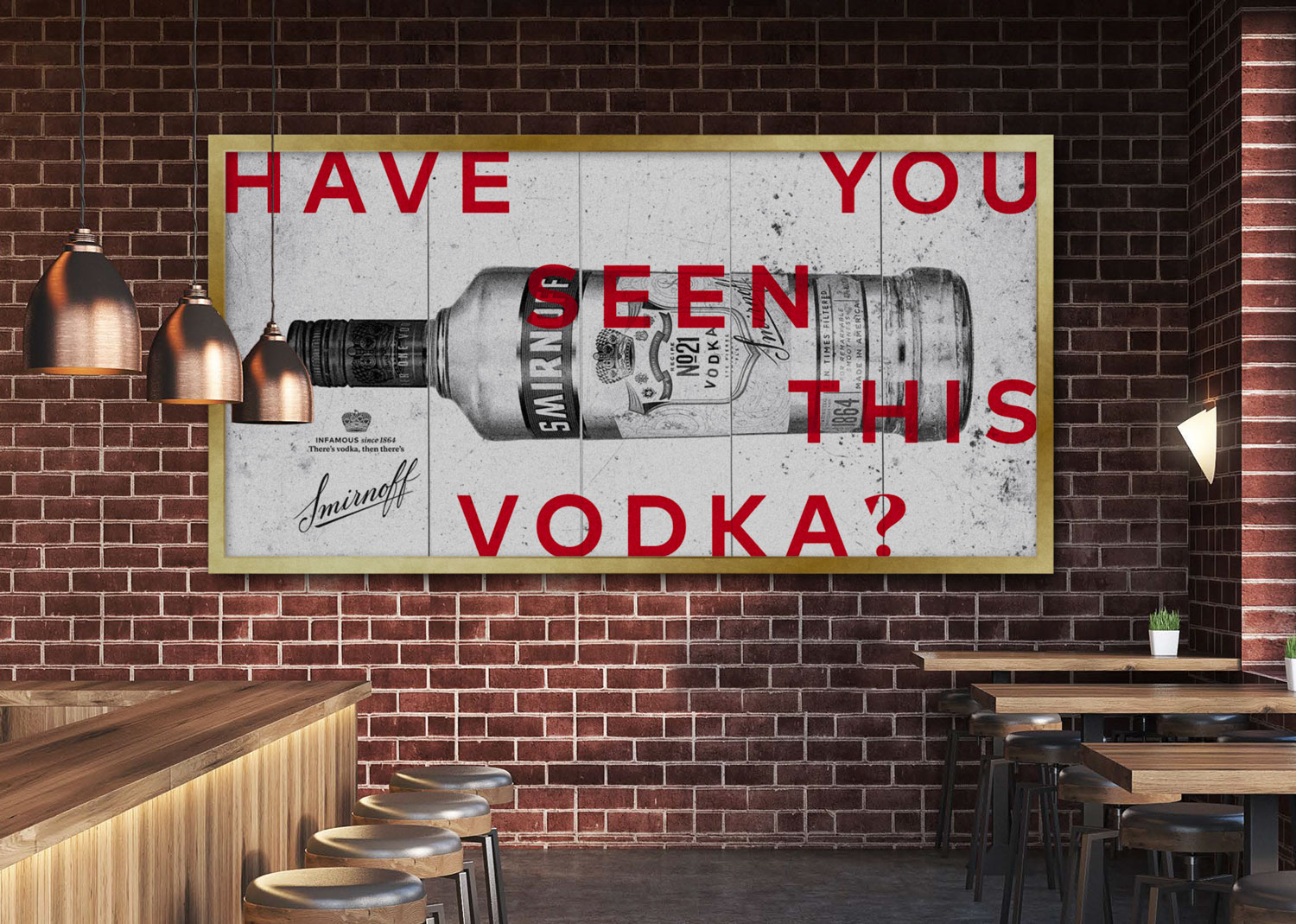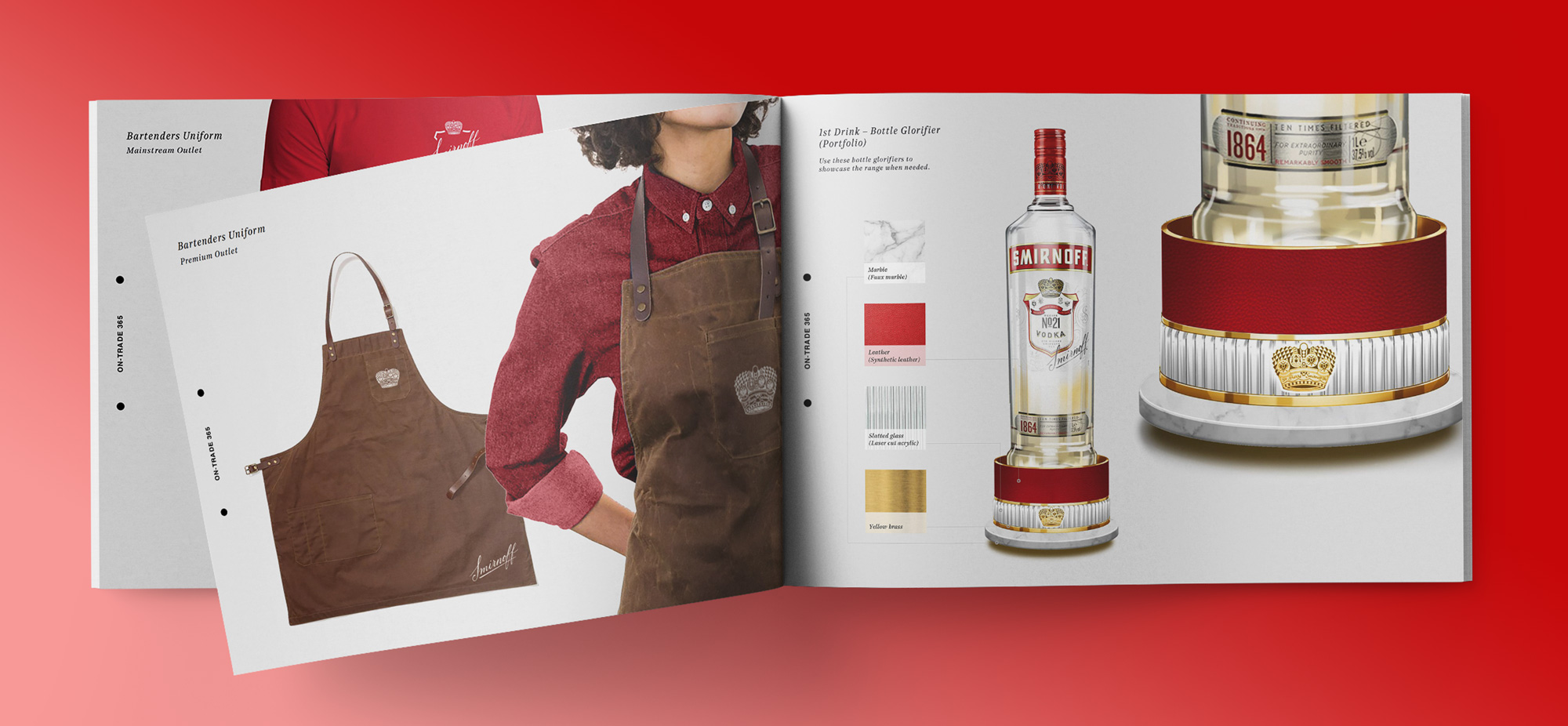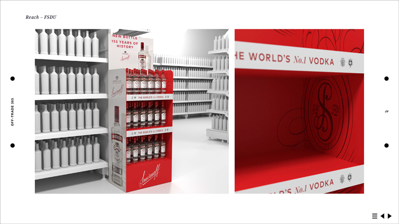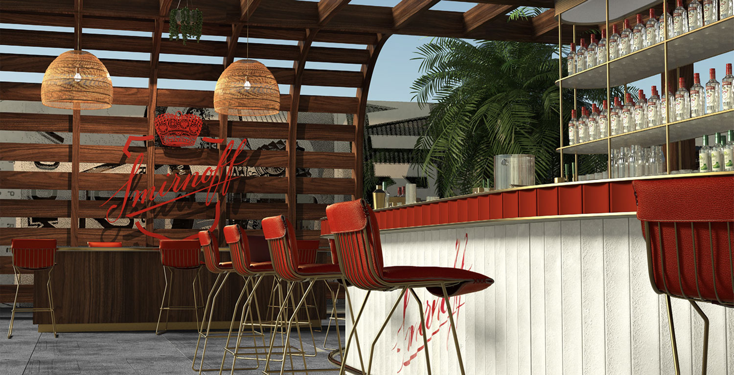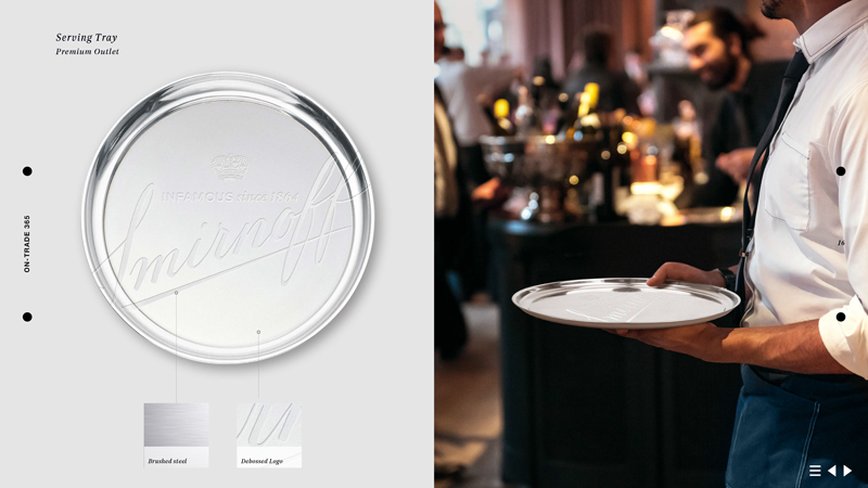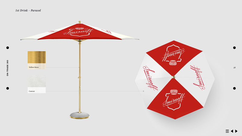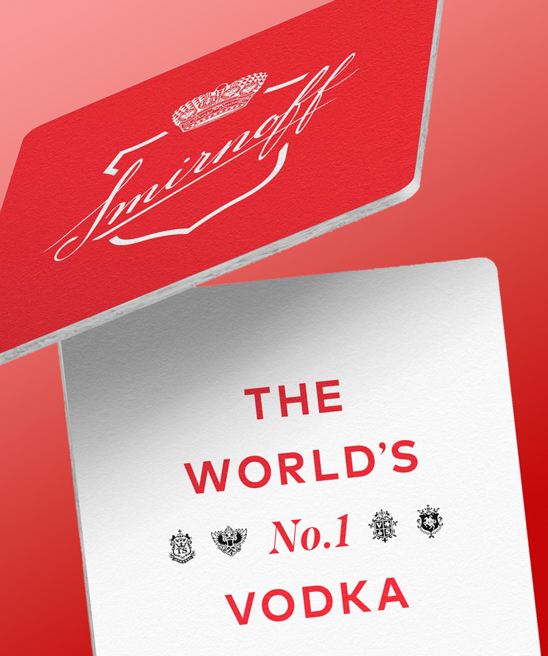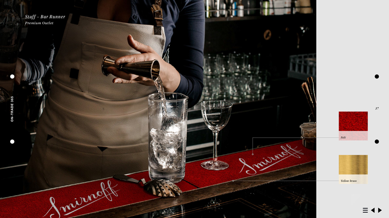 Designing how the campaign would come to life on-trade, off-trade and in 3rd spaces, each item had to bring to life Smirnoff's new brand positioning. Touchpoints ranged from designing bartender's uniforms, coasters, bottle glorifiers, signs, retail point of sale, through to external spaces.