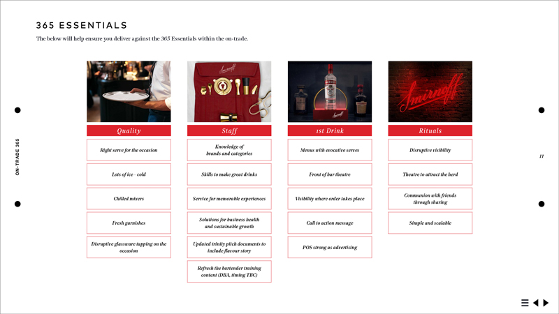 The final toolkit went out to local markets around the world, who would use this as their 'bible' to implement the Smirnoff Essentials campaign and activation in their area.