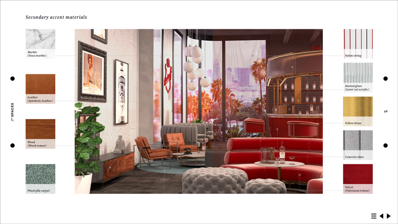 And so, the design of these environments had to follow a contemporary re-interpretation of the timeless glamor of a mid-century Hollywood hotel.
